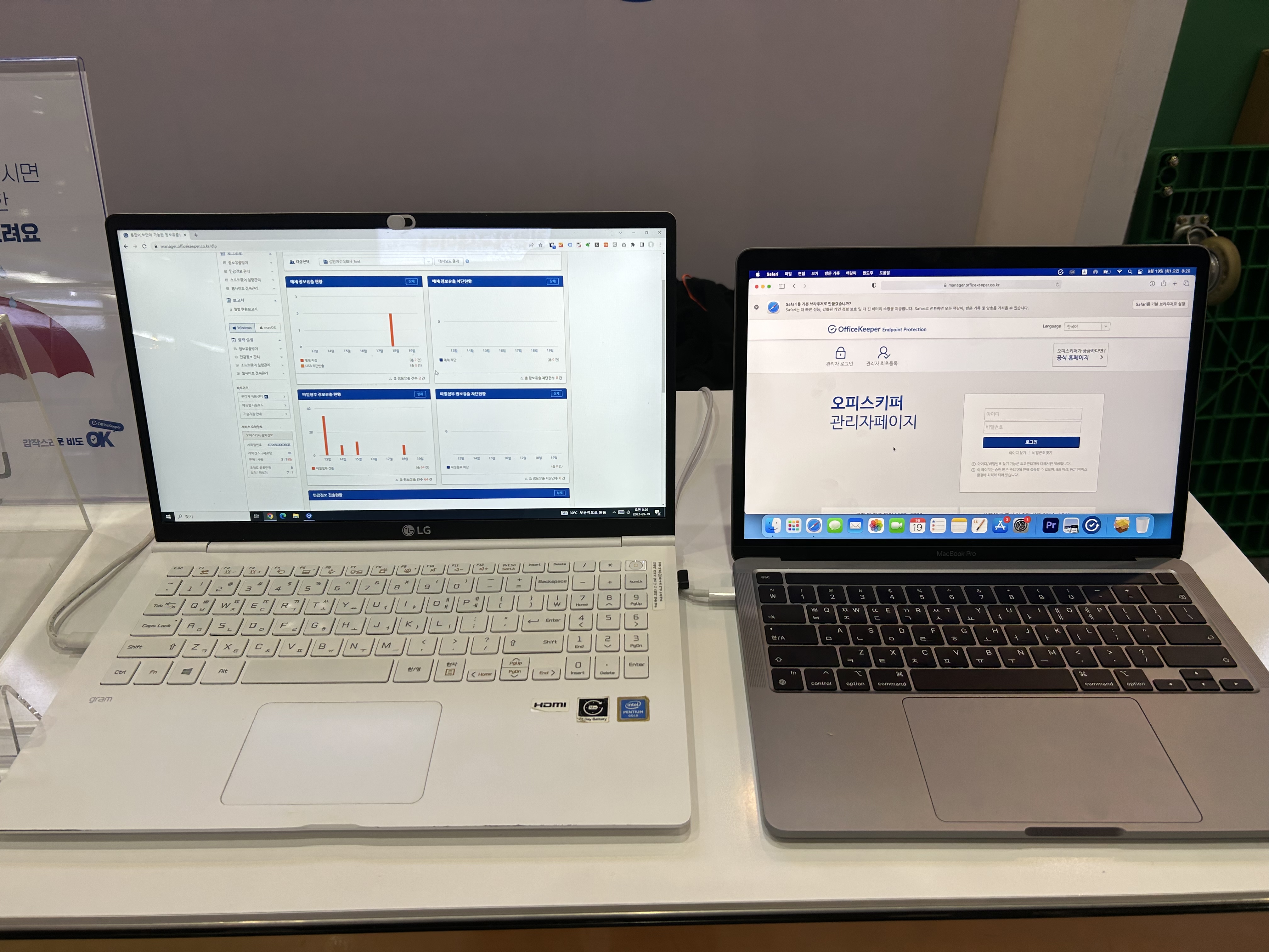 오피스키퍼의 다양한 보안 기능들을 한눈에 확인할 수 있도록 부스 뒷벽을 꾸며보았습니다. 😊 보안 담당자들이 궁금해할 만한 모든 것들을 오피스키퍼 하나로 해결할 수 있다는 콘셉트입니다.