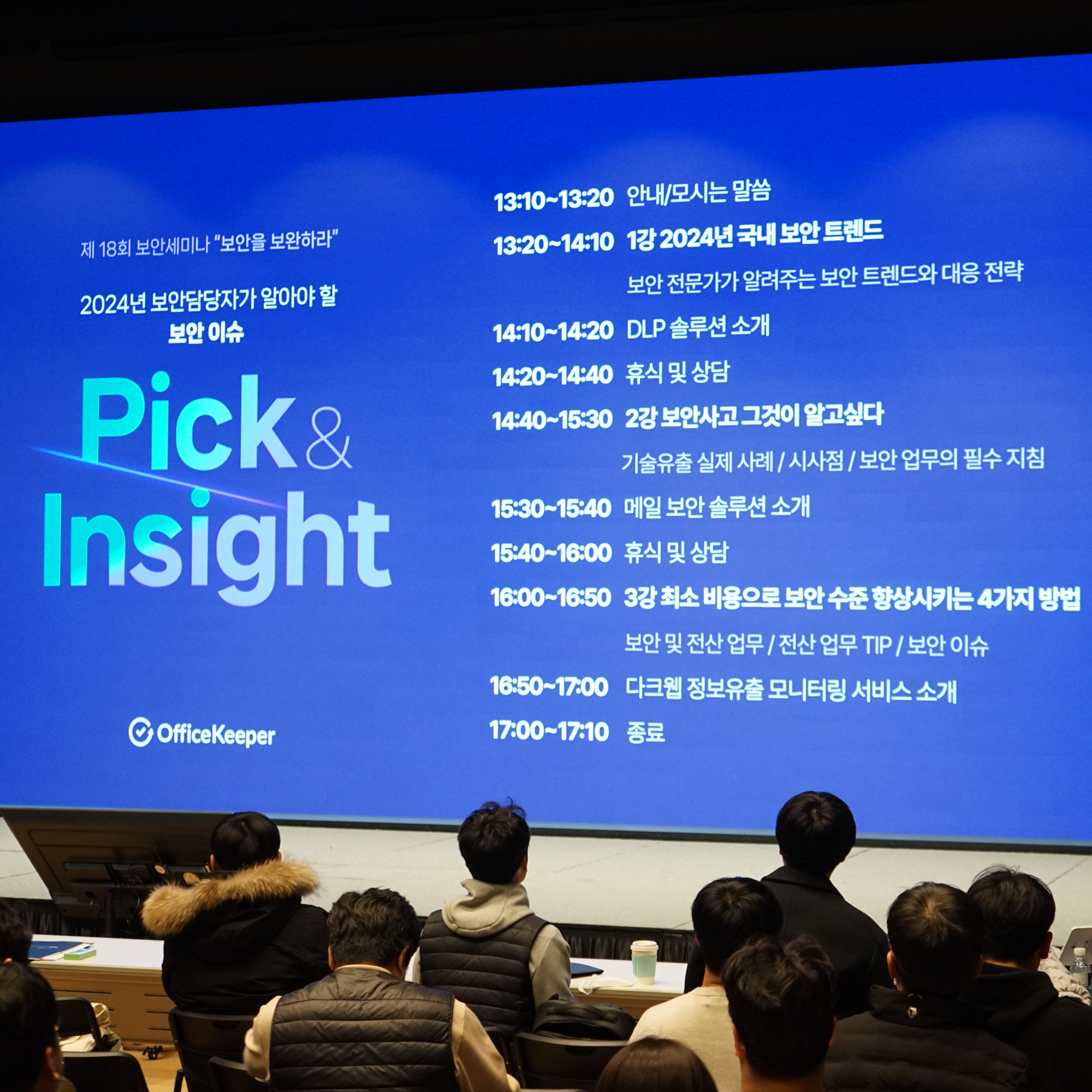 제18회를 맞이한 오피스키퍼 보안세미나는 올해 6월에 이어 다시 한번 현장에서 만나 뵌 세미나였는데요! 이번 보안세미나는 '2024년 보안담당자가 알아야 할 보안 이슈'라는 주제로 진행되었습니다. 전문가들이 전하는 생생하고 정확한 이야기로 참가자분들이 더욱 의미 있는 시간을 보내셨을 거라 생각합니다. 😊👏