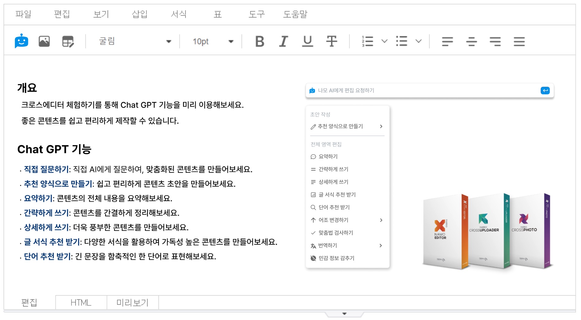 나모 크로스에디터에 챗GPT 기술이 적용되는 부분은 나모에디터 공식 웹사이트 내 크로스에디터 체험하기 페이지예요.