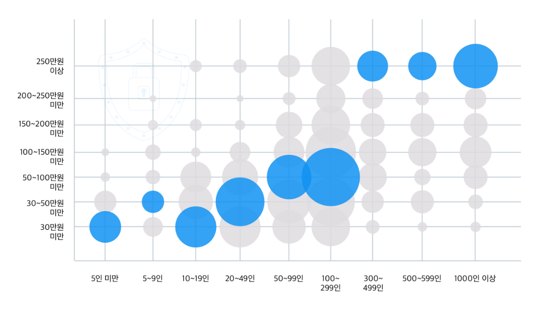 실제 기업 규모별로 분석해 본 결과, 300인 미만의 기업은 100만 원 이하로 응답하는 경우가 가장 많았고, 300인 이상의 기업은 250만 원 이상으로 응답하는 경우가 가장 많았습니다.