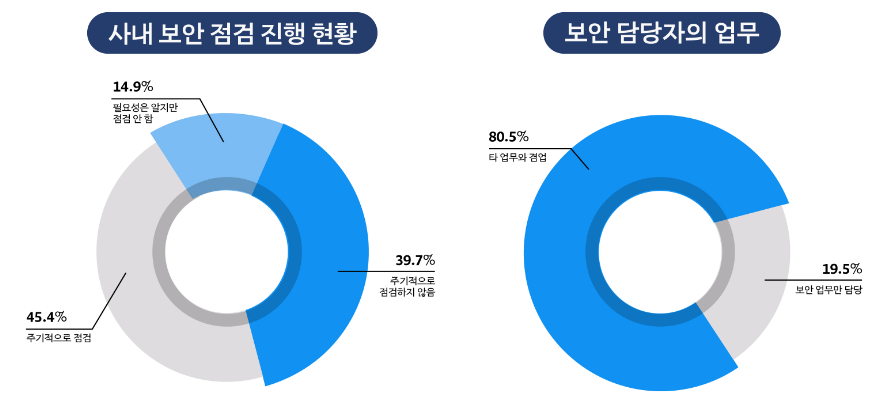보안 점검을 하지 않는 기업과 주기적으로 하지 않는 기업이 54.6%로 나타났습니다. 많은 기업의 보안 점검이 미흡한 상태인 것이죠. 특히, 보안 업무와 타 업무를 겸업하는 경우가 80.5%로 나타났는데요. 많은 기업에서 보안 관리가 부가적인 업무로 여겨지고 있음을 알 수 있습니다.