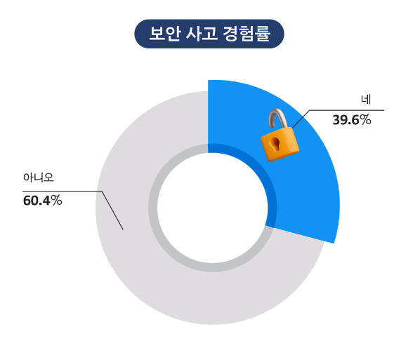 응답자 중 약 40%가 보안 사고를 경험한 적이 있다고 응답했습니다. 많은 국내 기업들이 보안 위협에 노출되어 있다는 것인데요.