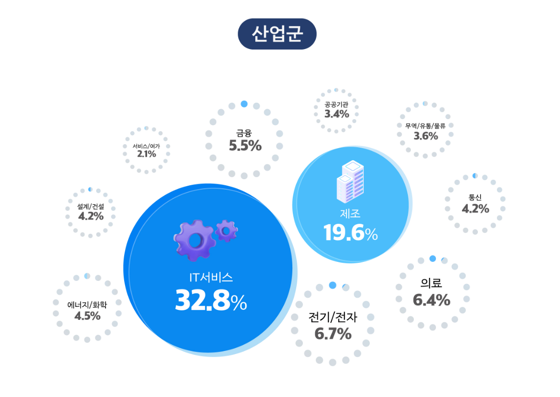 응답자의 업종으로는 IT 서비스업이 32.8%로 가장 많았으며, 제조업이 19.6%로 그 뒤를 이었습니다.