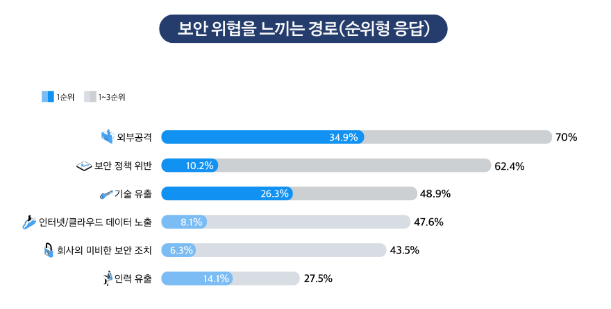 1순위로 가장 많이 선택된 보안 위협은 '외부공격'(34.9%)이었습니다. 다음으로는 '기술 유출'(26.3%)이 뒤를 이었습니다. 1~3순위를 종합한 결과에서는 '외부 공격'(70%)이 여전히 가장 높은 비율을 차지했지만, '보안 정책 위반'(62.4%)이라는 새로운 요소가 두 번째로 높은 비율로 나타났습니다. '기술 유출'(48.9%)도 여전히 중요한 우려 사항으로 나타났습니다.