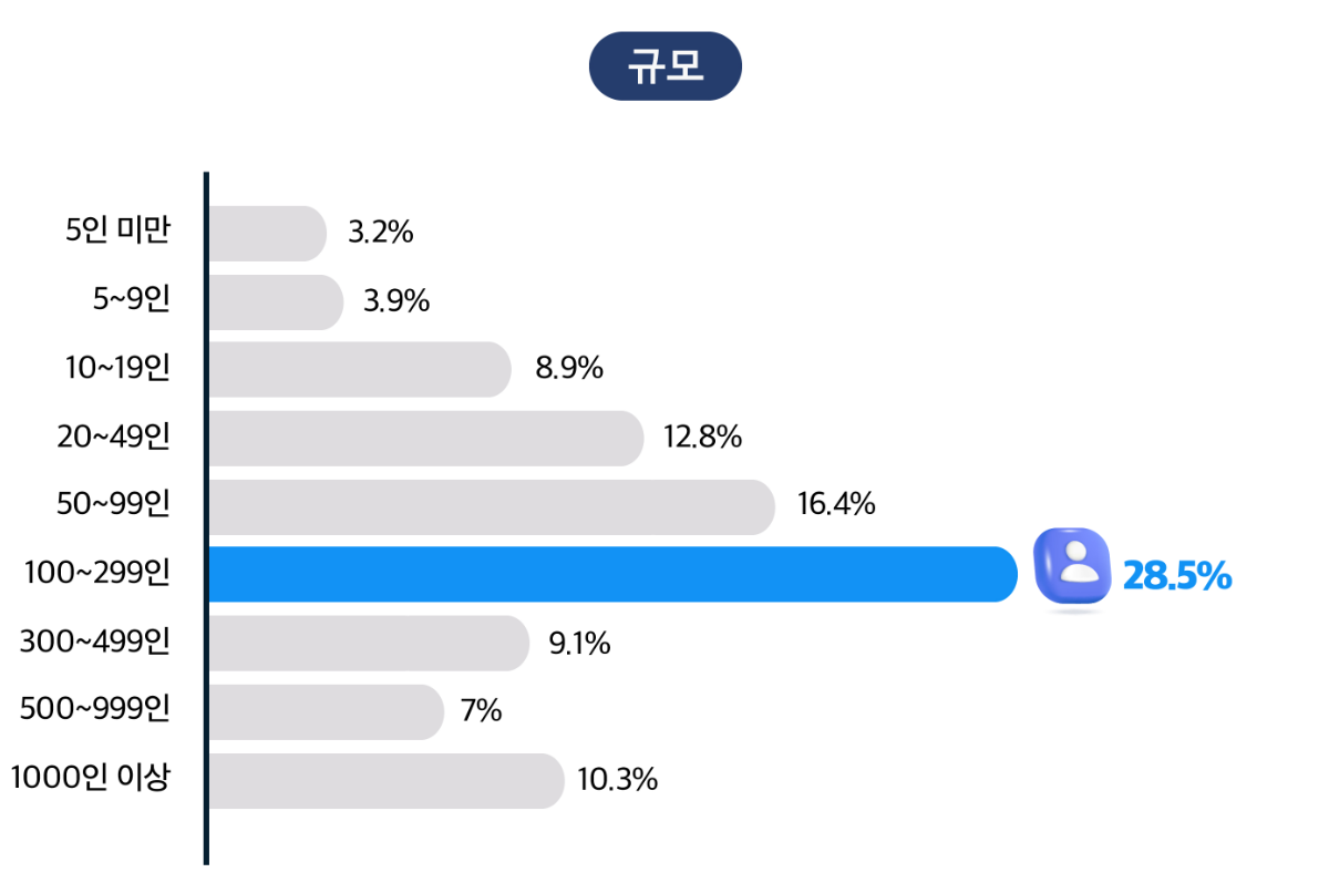 응답자가 속한 기업의 경우 '100~299인' 규모가 28.5%로 가장 많은 부분을 차지했으며, '50~99인' 규모가 16.4%로 뒤를 이었습니다.