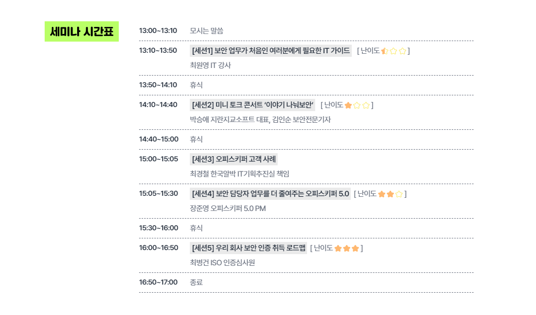 어떠신가요? 이번 19회 세미나는 많은 보안 담당자가 고민해 봤을 법한 내용들로 구성해 보았는데요!