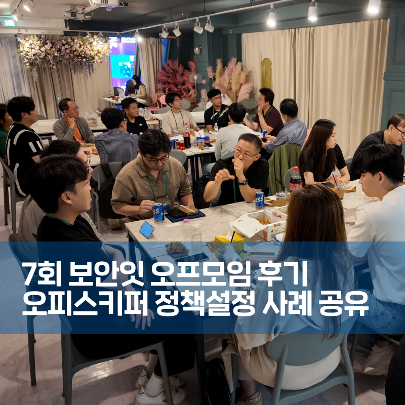 7회차 보안잇 오프모임에서 '다른 회사의 오피스키퍼 정책 설정'에 대해 논의한 내용을 확인하세요. 다양한 업종과 규모의 기업들이 공유한 보안 정책 설정 경험과 실무자의 의견을 통해 보안