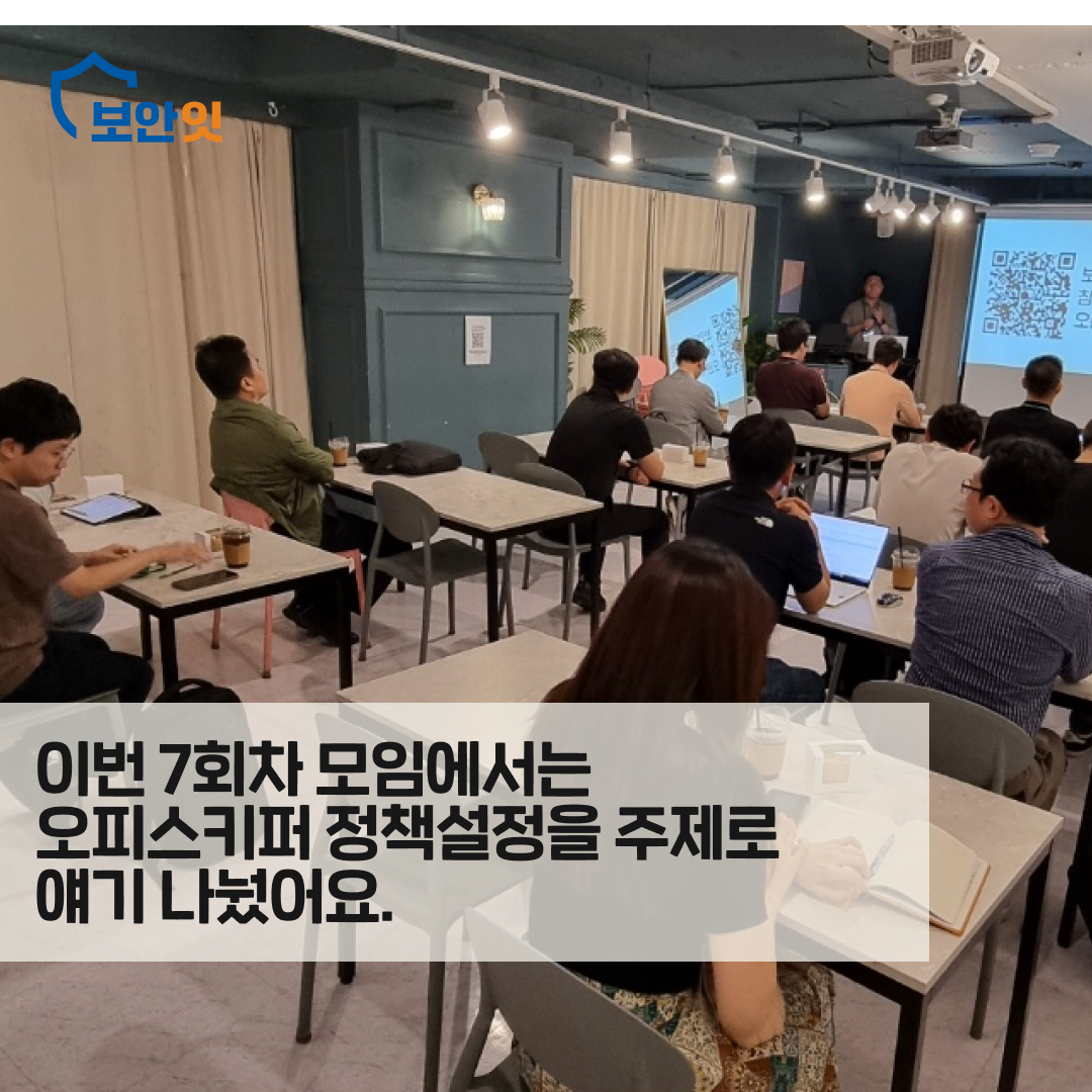 이번 7회 모임에서는 '오피스키퍼 정책 설정'이라는 구체적인 주제로 심도 있는 논의가 이루어졌는데요. 모임마다 정원은 20명이지만 이번에는 27명이 신청해주셨고, 그중 16명이 참석해 자리를 빛내주셨습니다. 특히 여러 번 참석하신 분들도 많아, 보안잇 오프모임의 가치를 증명해주었습니다.
