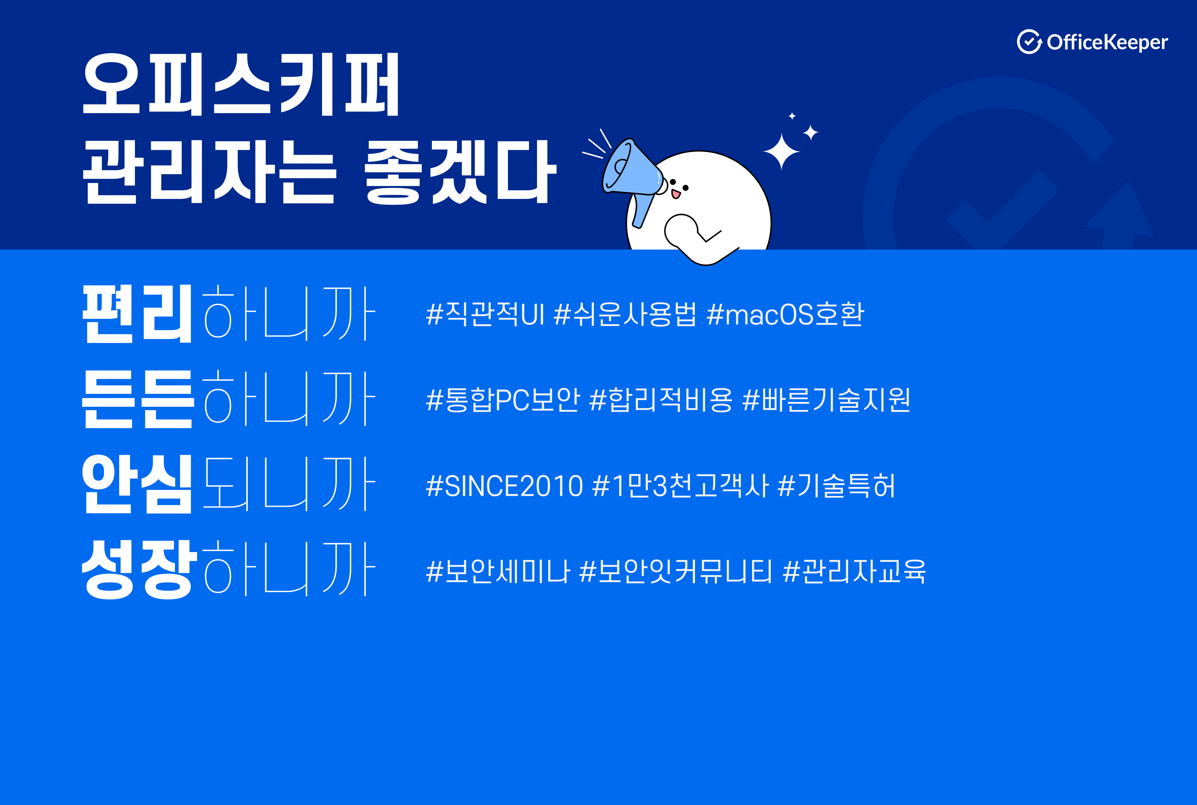 오피스키퍼의 장점 중 하나는 바로 ‘관리가 편하다’라는 점인데요. 관리 업무가 편해야, 완벽한 보안이 따라오죠. 관리가 편한 오피스키퍼는 보안 솔루션 도입뿐만 아니라 관리자교육, 보안 세미나, 커뮤니티 등을 정기적으로 진행하면서 관리자들이 200% 성장하고 활용할 수 있도록 지원하고 있습니다.