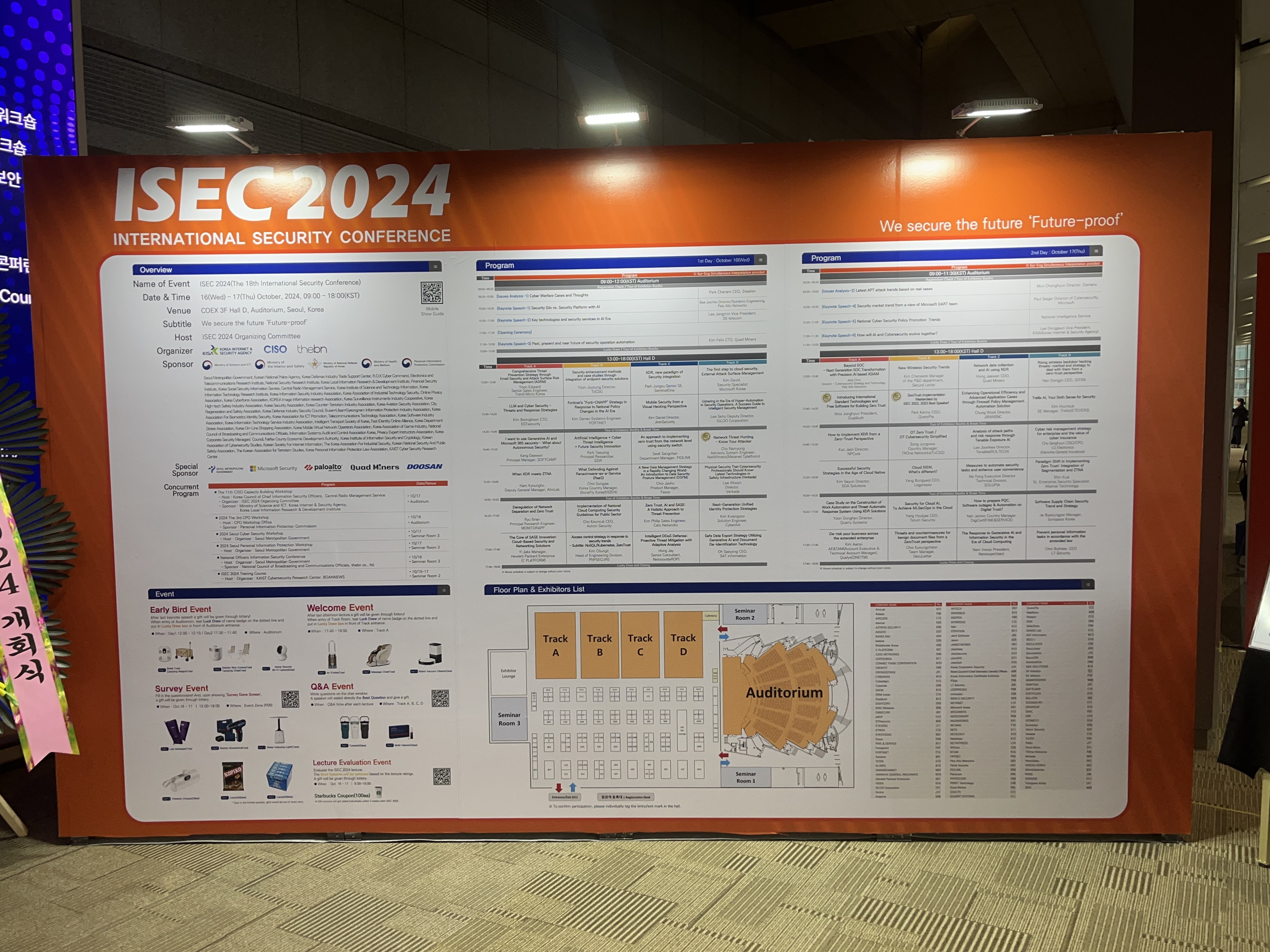 ISEC 2024는 아시아 최대 규모의 사이버 보안 컨퍼런스로, 최신 보안 트렌드와 이슈를 소개하고 디지털 전환에 따라 가속화되는 사이버 보안 위협에 대한 실질적인 대응방안을 제시하는 박람회예요. 올해는 ‘보안이 우리의 미래를 담보한다(Future-proof)’라는 주제로 개최되었습니다. AI 기술의 급격한 발전과 지능화되는 사이버 위협 속에서 우리의 미래를 지킬 수 있는 유일한 방법은 ‘보안’이라는 점을 강조했죠.🤓