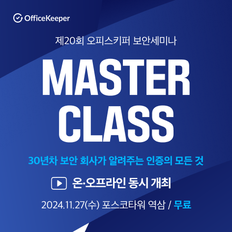 오는 11월 27일 수요일, 포스코타워 역삼에서 열리는 제20회 오피스키퍼 보안세미나, '보안 인증 마스터 클래스'에 초대합니다!💌