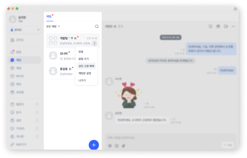 자주 쓰는 채팅방은 목록에 고정해 보세요. 자주 사용하는 채팅방을 최대 10개까지 상단에 고정할 수 있습니다. 상단 고정 기능을 통해 필요한 채팅방을 빠르게 찾아 소통해 보세요.
