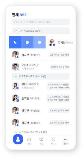 조직도에서 스와이프 메뉴가 추가되었어요! iOS로 오피스넥스트를 이용할 경우, 사용자 프로필을 클릭하지 않더라도 스와이프해 전화, 채팅, 메시지를 바로 사용할 수 있어요.