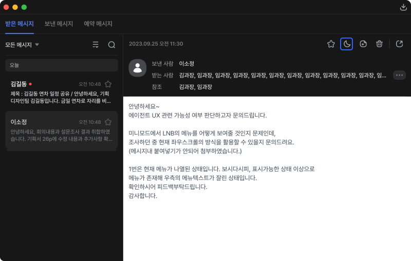 다크 모드 내에서 라이트모드를 활성화해 내용을 보다 선명하게 확인할 수 있습니다. 공지, 메시지, 메모에서 달 모양의 아이콘을 클릭하면 에디터 영역에 라이트 모드가 활성화됩니다. 이제 본문 내용을 보다 선명하게 확인해 보세요.