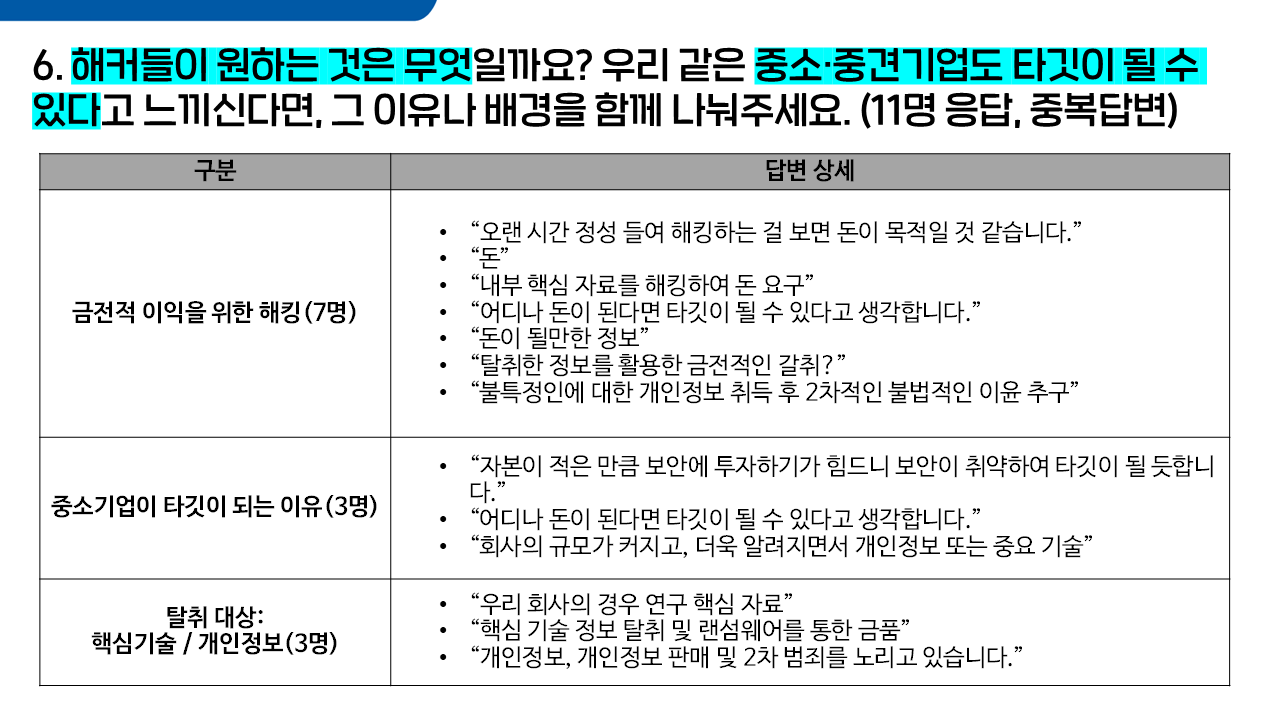 이어서 대규모 해킹 및 랜섬웨어 사고를 지켜본 IT・보안 업무 담당자 분들의 고민을 공유했어요. 해킹 위협에 대해 전반적으로 불안감이 높아졌다는 응답 결과가 가장 많았고 (6명), 보안 시스템이 정말 실효성이 있는지 의문이다, 개인정보가 어떻게 유출되어 어디에서 활용되고 있는지 모르겠다는 응답 결과(5명)가 뒤를 이었습니다.