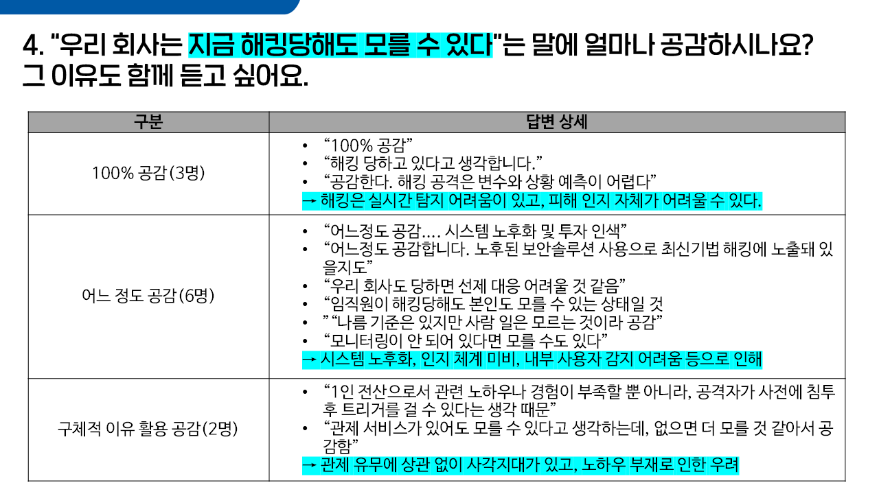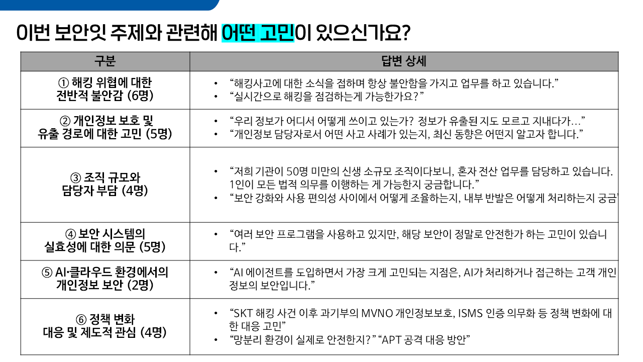 이어서 대규모 해킹 및 랜섬웨어 사고를 지켜본 IT・보안 업무 담당자 분들의 고민을 공유했어요. 해킹 위협에 대해 전반적으로 불안감이 높아졌다는 응답 결과가 가장 많았고 (6명), 보안 시스템이 정말 실효성이 있는지 의문이다, 개인정보가 어떻게 유출되어 어디에서 활용되고 있는지 모르겠다는 응답 결과(5명)가 뒤를 이었습니다.