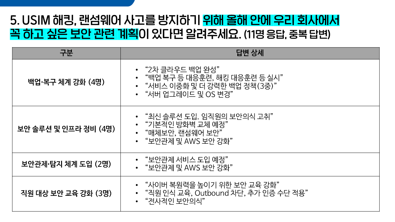 전반적으로 IT・보안 업무 담당자의 개인정보 해킹 및 랜섬웨어 사고에 대한 불안도가 매우 높고, 실질적인 해결 방안에 대해 깊게 고민하고 있음을 알 수 있었던 대목이었어요.