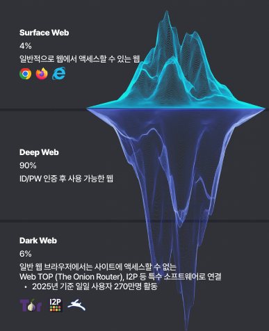 - 딥웹 (Deep Web) : 로그인이나 접근 권한이 있어야 보이는 비공개 영역 (사내 인트라넷, 금융 정보 등)