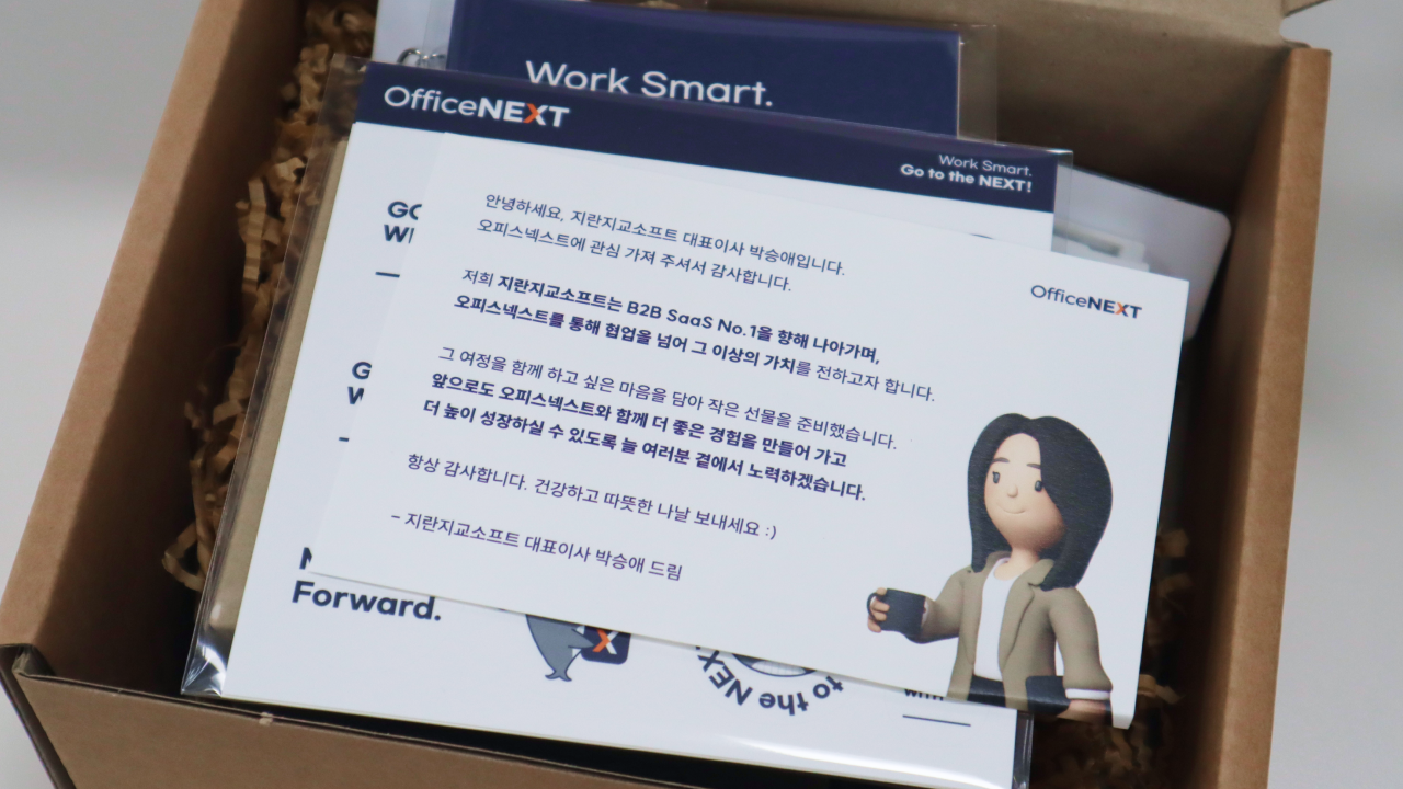 웰컴 키트를 개봉하면 가장 먼저 오피스넥스트를 만들고 있는 지란지교소프트 박승애 대표님의 편지를 보실 수 있어요. 오피스넥스트가 지향하는 가치와 방향성, 그리고 오피스넥스트와 함께 고객들이 더 높게 성장하길 바라는 박쎄오의 진심을 담았습니다. 대표님이 직접 쓰신 편지인 만큼 고객 분들께 큰 귀감과 힘이 되길 바라고 있어요.