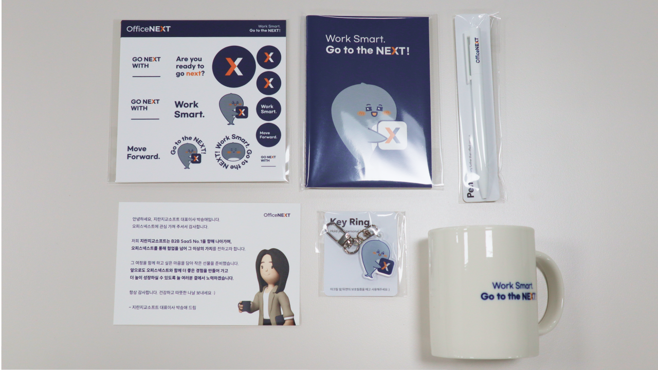 웰컴키트 속 머그컵은 오피스넥스트가 지향하는 방향이 담긴 'Work Smart. Go to the NEXT!'라는 문구가 전면에 인쇄되어 더욱 특별합니다. 오피스넥스트의 고객 분들이 더욱 똑똑하게 일하고, 업무의 다음 단계를 바라볼 수 있길 바라는 마음을 담았어요. 오피스넥스트의 지향점이 담긴 머그컵과 함께 업무 중 잠깐잠깐 행복한 충전의 시간을 가졌으면 합니다.