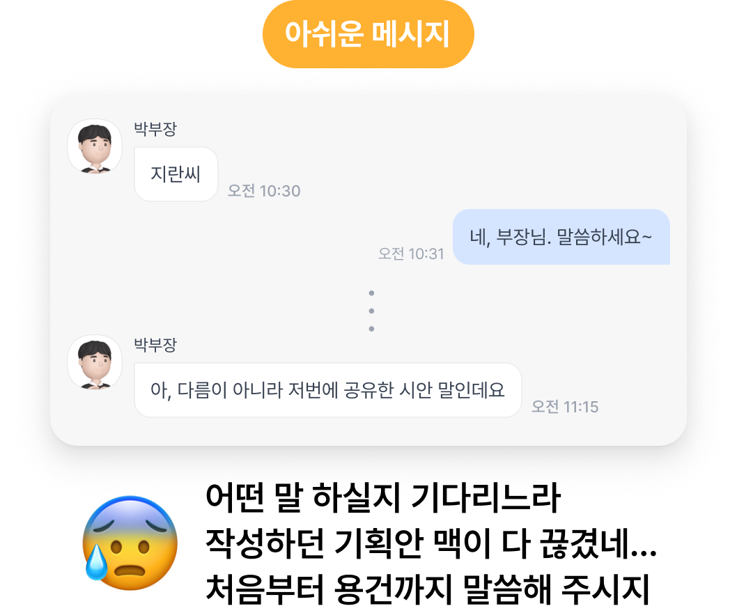 메시지를 받은 사람은 본론이 나올 때까지 다른 업무로 복귀하지 못한 채 'OO님' 말풍선만 하염없이 바라보게 되죠.