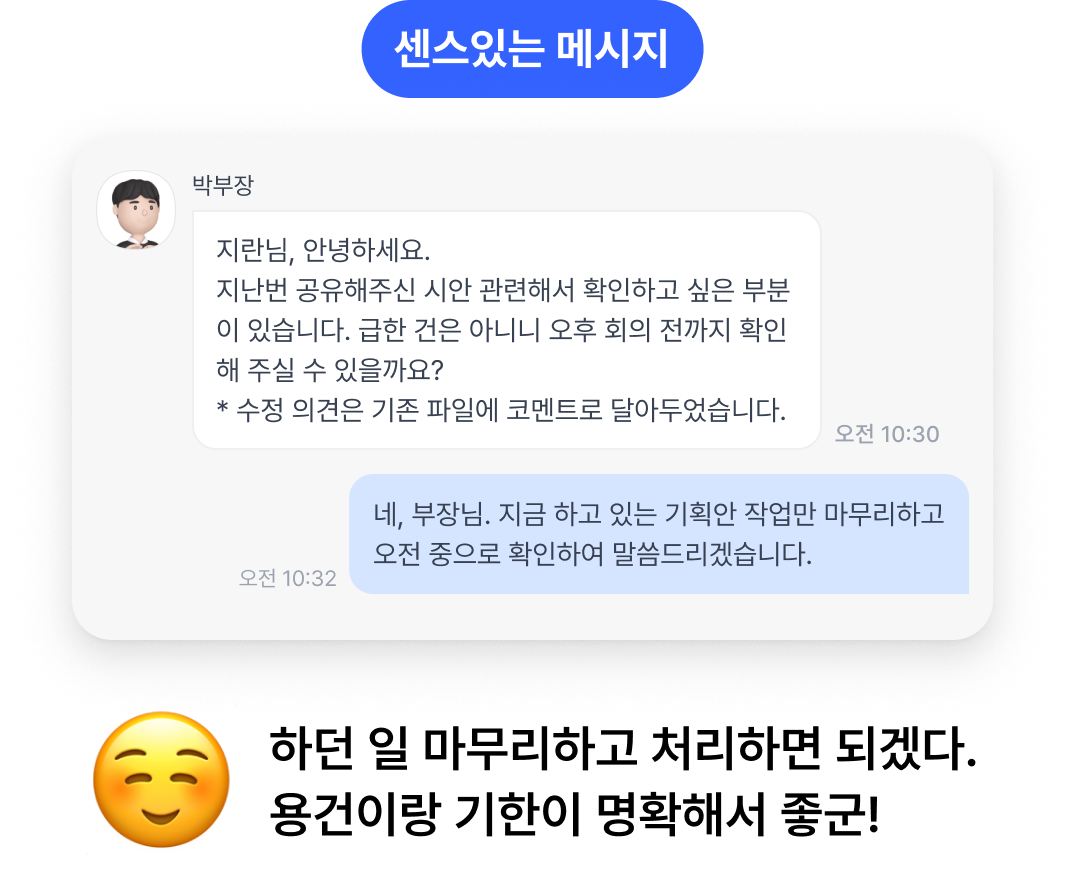 상대방이 ‘메시지를 읽자마자 할 일을 판단’할 수 있게 정보를 한 번에 던져주는 담백한 배려에서 시작돼요.